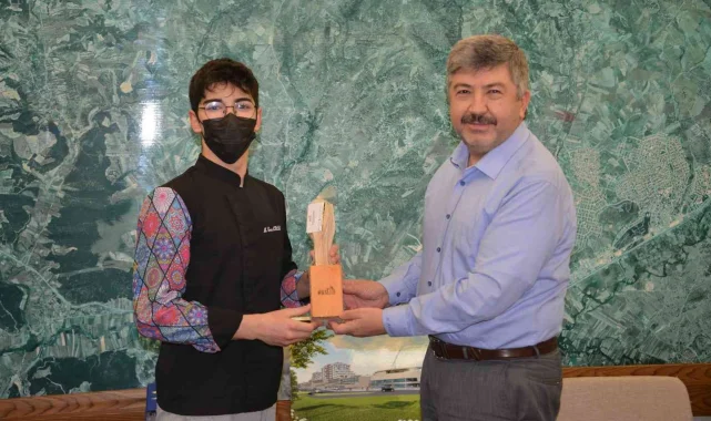 Antalya'da düzenlenen Gastro Antalya Uluslararası Gastronomi Mutfak Şenliği ve İstanbul Mutfak Günleri Yarışmaları'nda şampiyon olan Mustafa Eren Akalan, Gediz Belediye Başkanı Muharrem Akçadurak'ı makamında ziyaret etti.