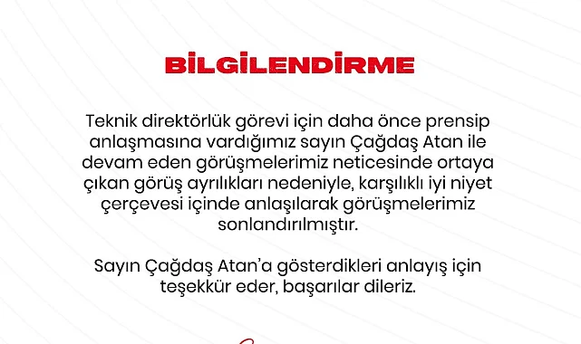 Spor Toto 1. Lig'de mücadele eden Samsunspor'da teknik direktör Çağdaş Atan ile yapılan görüşmeler olumsuz sonuçlandı. Samsunspor Kulübü'nden görüşmelerin son durumuyla ilgili bir açıklama yapıldı. Kulüpten yapılan açıklamada, "Teknik direktörlük görevi için daha önce prensip anlaşmasına vardığımız Çağdaş Atan ile devam eden görüşmelerimiz neticesinde ortaya çıkan görüş ayrılıkları nedeniyle karşılıklı iyi niyet çerçevesinde anlaşılarak görüşmelerimiz sonlandırılmıştır. Çağdaş Atan'a gösterdikleri anlayış için teşekkür eder, başarılar dileriz" ifadeleri kullanıldı.