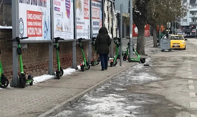 Eskişehir'de kaldırım boyunca sıralanmış şekilde bırakılan elektrikli scooterlar, bazı bölgelerde yaya ulaşımını zorlaştırıyor.