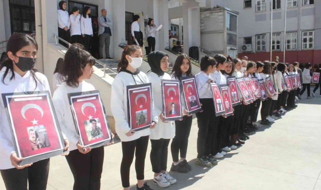 Adıyaman Mehmet Akif Ersoy Ortaokulu öğrencileri, 18 Mart Şehitleri Anma Günü ve Çanakkale Deniz Zaferi'nin 107. Yıl Dönümünü nedeniyle düzenlenen programda şehitlerin çerçeve içerisindeki fotoğraflarını taşıdı.