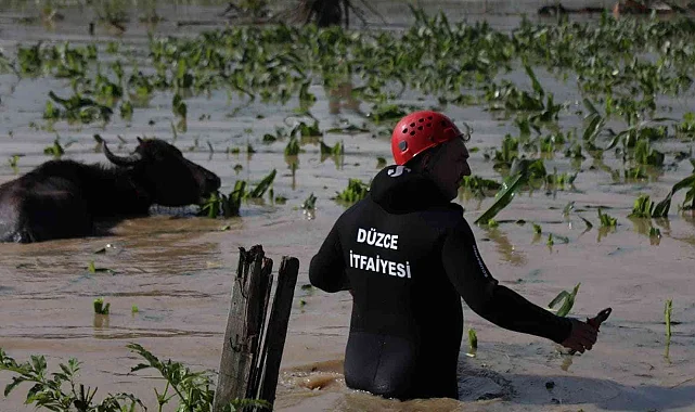 Düzce Belediyesi İtfaiye ekipleri, selde mahsur kalan hayvanları kurtarma operasyonu düzenledi.