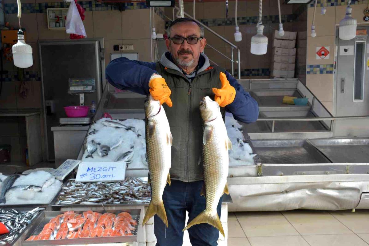 Balıkçı İbrahim Gündoğdu yaptığı açıklamada, "Bu kefal balığının büyüğü buna 'tokmak kafa' derler. Çok lezzetli bir balıktır. İki balık toplam 6 kg ağırlığında. Balıkların kilosunu 100 liradan satışa sunduk" dedi.
