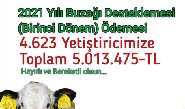 Tarım ve Orman Bakanlığı'nca düzenlenen tarımsal destek paketi 2021 yılı birinci dönem buzağı desteklenmesinde, Bakan Vahit Kirişci'nin açıkladığı toplam 1 milyar 602 milyon 683 bin 221 liralık ödeme başladı. Sinop'ta hak edişleri kesinleşen 4 bin 623 yetiştiriciye toplam 5 milyon 13 bin 475 TL destek, bir kısmın hesaplarına aktarıldı, kalanlara ise 29 nisandan sonra yatırılacak.