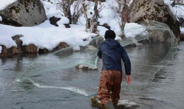 Beytüşşebap ilçesinde bulunan Habur Çayı, kış aylarında buz gibi suda, hava sıcaklığının eksi 21 dereceyi bulmasıyla vatandaşlar, serpmelerle balık avına çıkıyor. Kilosunu 25 liradan satarak geçimini sağlayan yöre halkı, soğuk havalara aldırış etmeden giydikleri tulumlar sayesinde 2 metreyi bulan derinliklerde alabalık avlamaya çalışıyor.