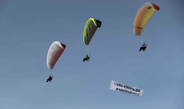 SMA'lı 14 aylık Ela Beyazgül'e umut olmak isteyen İzmirli paramotorcular, 'Seninleyim Ela' yazılı bir afişle İzmir semalarında uçtu.