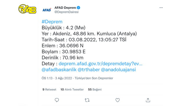 Afet ve Acil Durum Yönetimi Başkanlığının (AFAD) sosyal medya hesabından yapılan açıklamada, saat 13.05'te merkez üssü Antalya'nın Kumluca ilçesi olan 4,2 büyüklüğünde sarsıntı kaydedildi.