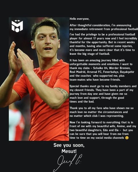 Mesut Özil sosyal medya hesabından yaptığı paylaşımda, "Uzun süren düşüncelerin ardından futbolu bıraktığımı açıklıyorum. 17 yıl boyunca profesyonel futbolcu olmak bir ayrıcalıktı. Bu fırsat için kendimi minnettar hissediyorum. Ancak, geçtiğimiz haftalarda ve aylarda uzun süreli sakatlıklar yaşadım. Futbolu bırakmamın zamanının geldiğini hissettim." ifadelerini kullandı.