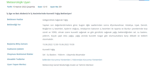 '' Yapılan son değerlendirmelere göre; bugün öğle saatlerinden sonra Afyonkarahisar, Kütahya, Uşak, Denizli, Muğla'nın iç kesimleri, Aydın'ın doğusu, Antalya'nın batısının iç kesimleri ile Isparta ve Burdur çevrelerinde kısa süreli ve YEREL olmak üzere kuvvetli sağanak ve gök gürültülü sağanak yağış beklendiğinden sel, su baskını, yıldırım, küçük çaplı dolu yağışı, yağış anında kuvvetli rüzgar gibi olumsuzluklara karşı dikkatli ve tedbirli olunmalıdır. '' ifadelerini kullandı