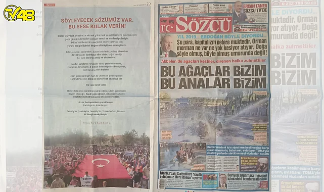 Manşetine Akbelen'de katledilen ağaçları taşıyan Sözcü gazetesi tam sayfa Yk enerjinin reklamını bastı.
