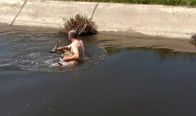 Sulama kanalına düşen karacayı muhtar kurtardı