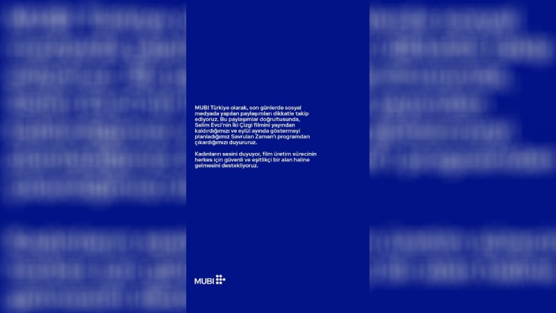 "MUBI Türkiye olarak, son günlerde sosyal medyada yapılan paylaşımları dikkatle takip ediyoruz. Bu paylaşımlar doğrultusunda, Selim Evci’nin İki Çizgi filmini yayından kaldırdığımızı ve eylül ayında göstermeyi planladığımız Savrulan Zaman’ı programdan çıkardığımızı duyururuz. Kadınların sesini duyuyor, film üretim sürecinin herkes için güvenli ve eşitlikçi bir alan haline gelmesini destekliyoruz."