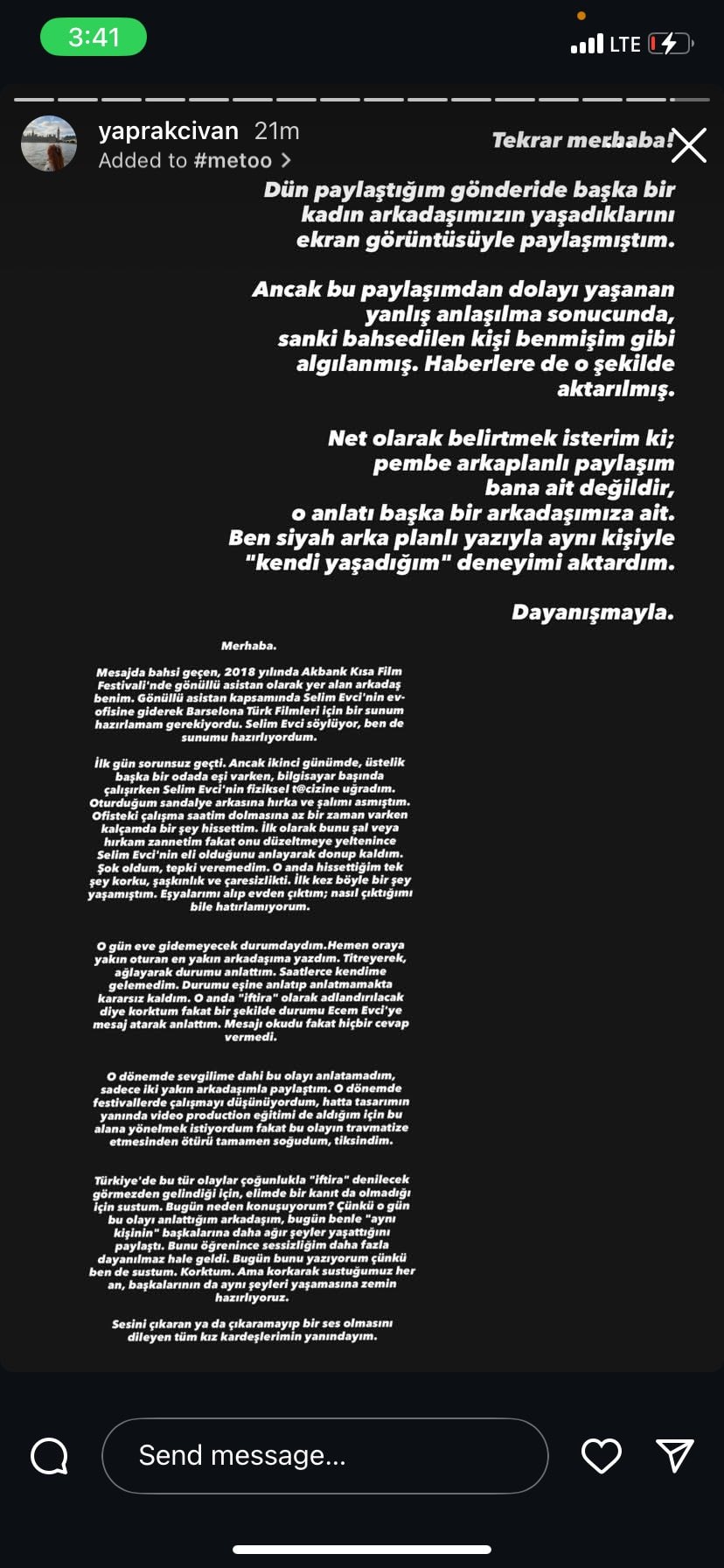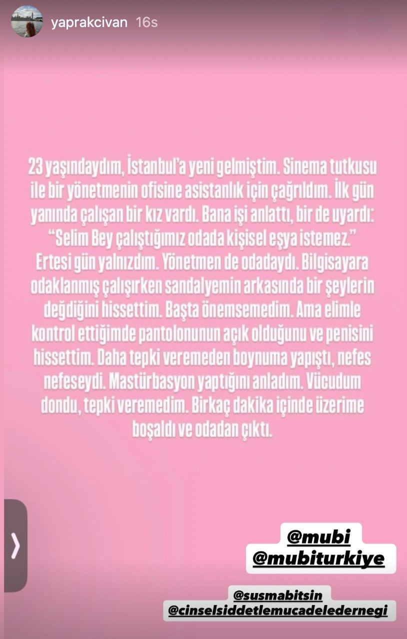 Oyuncu Tayanç Ayaydın ile başlayıp Mehmet Yılmaz Ak, komedyen Mesut Süre ve fotoğrafçı Cemil Batur Gökçeer'in ardından bir taciz iddiası daha gündeme geldi. Tasarımcı Yaprak Civan, yönetmen Selim Evci'nin ofisinde asistanlık yaparken fiziki tacizine uğradığını iddia etti. Ardından MUBI, Evci'ye ait filmleri yayından kaldırdı. Sonrasında ise Akbank Sanat da Akbank Kısa Film Festivali kapsamında hizmet aldıkları şirketin yöneticisi Evci ilişkilerini sonlandırıldığını açıkladı.