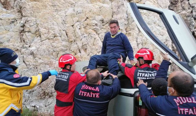 Muğla'da yağış sonrası kayganlaşan zeminde direksiyon hakimiyetini kaybeden ve araç içinde sıkışan sürücüyü itfaiye ekipleri kurtardı.