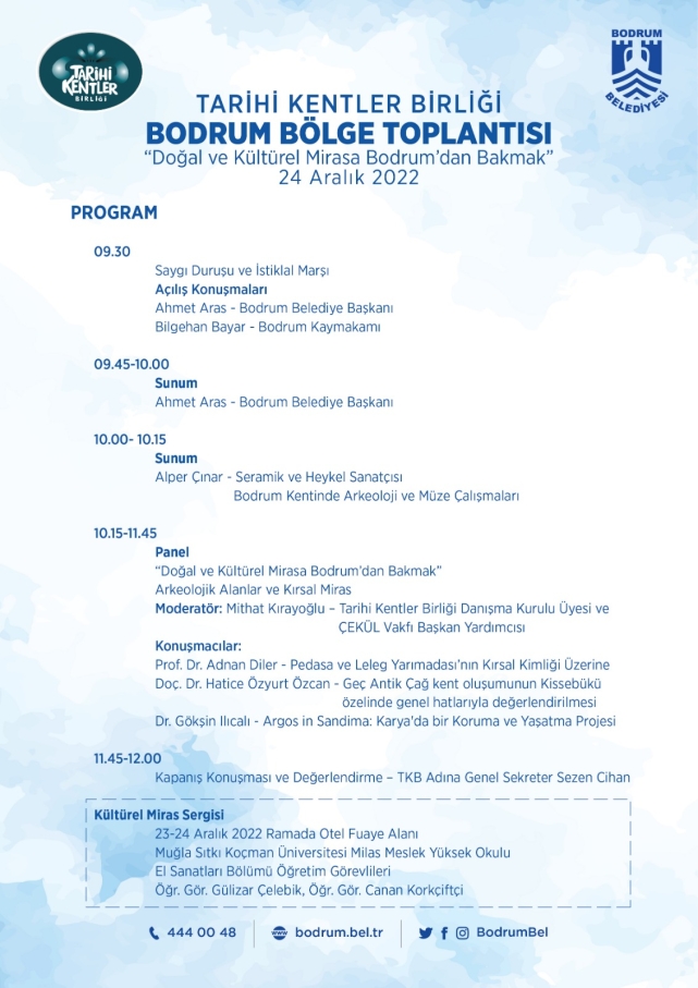 Program, 24 Aralık Cumartesi günü saat 09.30’da Bodrum Kaymakamı Bilgehan Bayar ve Belediye Başkanı Ahmet Aras’ın açılış konuşmaları ile başlayacak. Daha sonra, Belediye Başkanı Ahmet Aras’ın gerçekleştireceği sunum ve “Doğal ve Kültürel Mirasa Bodrum’dan Bakmak: Arkeolojik Alanlar ve Kırsal Miras” konulu panel ile sürecek. Üye belediyelerin katılımı ile gerçekleştirilecek program kapsamında, Bodrum ve bölgesi için “Doğal ve Kültürel Mirasa Bodrum’dan Bakmak” konu başlığı belirlendi.