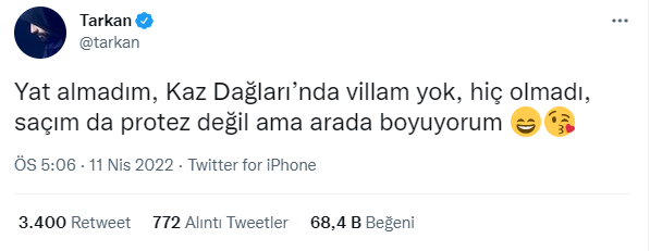 Hakkında çıkan diğer iddialara da bir tweet ile yanıt veren Tarkan, şunları söyledi: