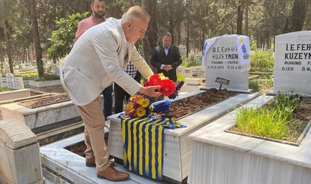 Başkan İlk, merhum Kuzeyman'ın mezarına 33 nolu Sarı lacivertli çubuklu forma ve biri sarı lacivert, diğeri ise sarı kırmızı renkli çiçek bıraktı.