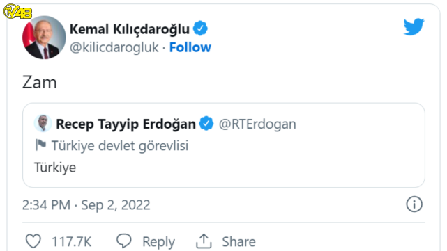 AKP Genel Başkanı ve Cumhurbaşkanı Recep Tayyip Erdoğan'ın "Türkiye" yazmasının ardından Cumhuriyet Halk Partisi (CHP) Genel Başkanı Kemal Kılıçaroğlu, tweeti alıntılayarak "Zam" yazdı.