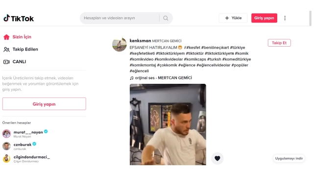 Buradaki bağlantıyı kullanarak masaüstü internet tarayıcınız üzerinden ya da mobil internet tarayıcınızdan TikTok internet sitesini açtığınız zaman platformun ana sayfası ile karşılaşacaksınız. Sayfada aşağı yukarı hareket ederek videolar arasında gezinebilirsiniz. Dilerseniz önerilen popüler içerik üreticilerinin sayfalarını ziyaret ederek onların paylaşımlarını da görebilirsiniz.