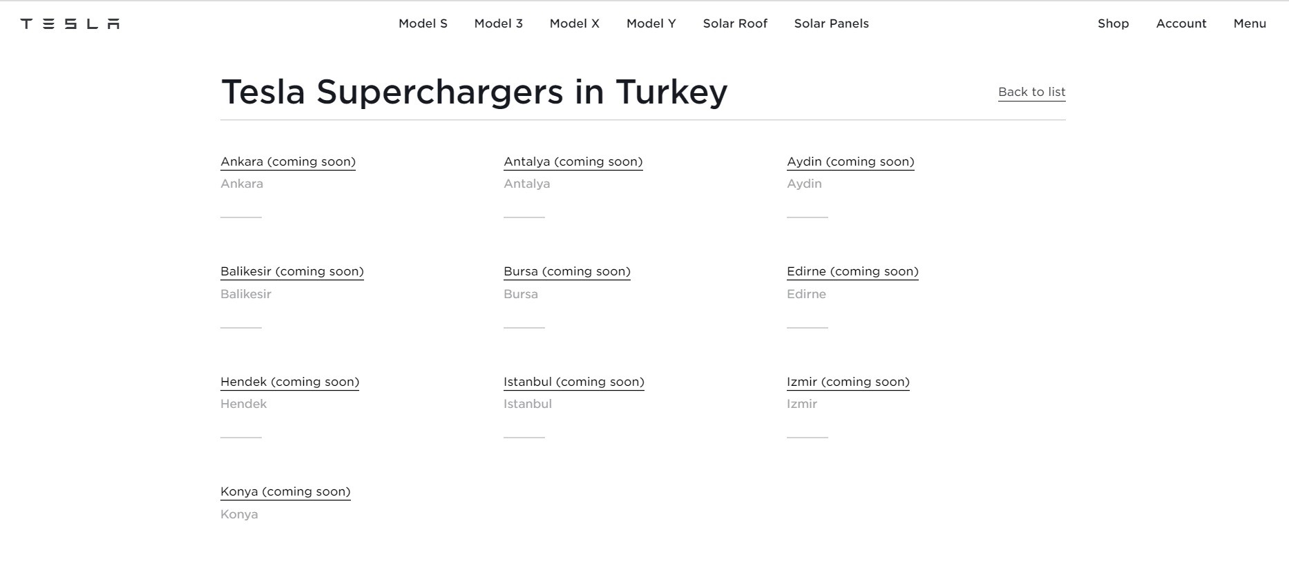 ABD’li elektrikli otomobil üreticisi Tesla, Türkiye’nin 10 ilinde şarj istasyonu kurmak için harekete geçti. Tesla'nın resmi internet sitesindeki bilgilere göre kurulacak olan şarj istasyonlarının konumu da paylaşıldı.