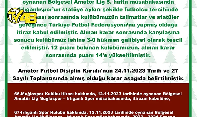 Kararda şu ifadelere yer verildi: "Muğlaspor Kulübü itirazı hakkında, 12.11.2023 tarihinde oynanan Bölgesel Amatör Lig Muğlaspor-Irlıganlıspor müsabakasında, itirazın kabulüne, Irlıganlıspor hakkında, 2023-2024 sezonu Bölgesel Amatör Lig statüsünün 4/2 maddesinde belirtilen futbolcu uygunluğuna ilişkin hükmün ihlal edilmesi nedeniyle Futbol Müsabaka Talimatı madde 22/d uyarınca 3-0 hükmen mağlubiyet cezası verilmesine karar verilmiştir."
