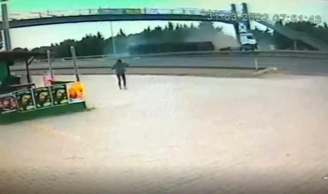 Tekirdağ'ın Çorlu ilçesinde kontrolden çıkan tırın üst geçide çarpması sonucu meydana gelen kazada, sürücü feci şekilde hayatını kaybetti. Kaza anı ise güvenlik kamerasına yansıdı.