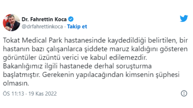"Tokat Medical Park hastanesinde kaydedildiği belirtilen, bir hastanın bazı çalışanlarca şiddete maruz kaldığını gösteren görüntüler üzüntü verici ve kabul edilemezdir. Bakanlığımız ilgili hastanede derhal soruşturma başlatmıştır. Gerekenin yapılacağından kimsenin şüphesi olmasın."