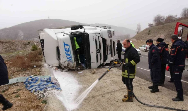 Tokat'ta et yüklü tırın devrilmesi sonucu meydana gelen kazada 1 kişi yaralandı.