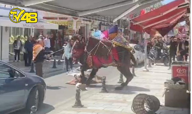 Bodrum’da ağırlık götürme töreni esnasında otomobilden ürken deve, zıplamaya başladı. Caddede yürüyen insanların yaşadığı panik anbean cep telefonu kameralarına yansıdı.