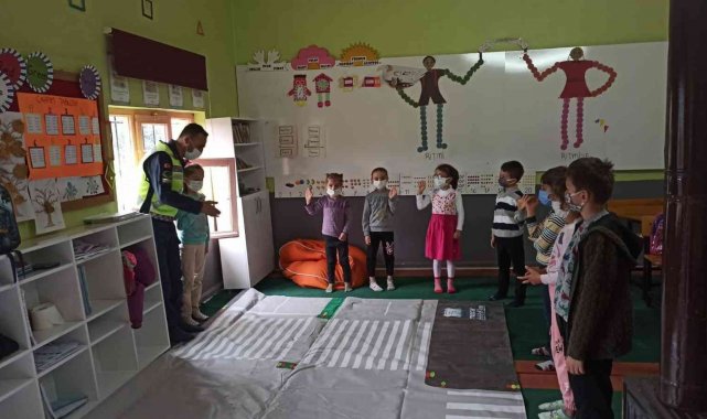 Çocuklarda trafik bilinci oluşturmak amacıyla düzenlenen eğitimlerde öğrencilere, trafik ışığı, işaret ve levhaları, yaya yolları, öğrenci servislerini kullanma, emniyet kemeri konularında bilgi verildi.