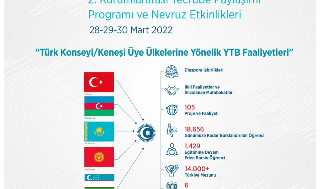 YTB'nin koordinesinde sekiz yıl sonra Türk Devletleri Teşkilatı üye ülke diasporaları yeniden buluşuyor. Türk Devletleri Teşkilatı'nın (TDT) 2. Diaspora Forumu, 2. Kurumlararası Tecrübe Paylaşımı Programı ve Nevruz etkinlikleri 28-30 Mart tarihleri arasında Bursa'da gerçekleştirilecek. YTB kurulduğu günden bu yana Türk Devletleri Teşkilatı ülkeleri olan Azerbaycan, Kazakistan, Kırgızistan ve Özbekistan'a yönelik eğitim, gençlik, ulaşım, sağlık, ekonomi, adalet, akademi ve kültürel alanlarda 105 proje hayata geçirildi.