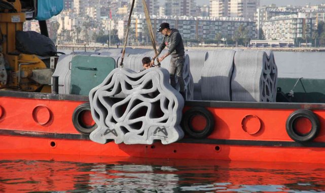 MERSİN (İHA) – Türkiye'de ilk kez 3D yazıcıyla üretilen yapay resifler, Mersin'de denize bırakıldı. Mersin Büyükşehir Belediyesi, balık popülasyonunu artırmak, ekosistemin bozulmasının önüne geçmek amacıyla ilk etapta 12 adet yapay resifi kent açıklarında denize yerleştirdi. Mersin Büyükşehir Belediye Başkanı Vahap Seçer'in telsizle verdiği komutla denize indirilen yapay resifler, doğal ve çevreye uyumlu olma özellikleriyle başta balıklar olmak