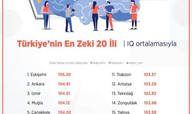 Zekâ seviyelerini merak eden vatandaşların girip çeşitli soruları cevaplandırarak IQ ortalamalarını ölçebileceği sitenin dün paylaştığı bir liste, sosyal medyada gündem oldu. Liste birçok Eskişehirli tarafından sosyal medyada büyük ilgi gördü. Türkiye'nin en zeki 20 ilini gösteren listede Eskişehir, en zeki il olarak yer aldı. Yayınlanan istatistiklere göre Eskişehir'in ardından, Ankara ikinci sırada yer alırken, İzmir en zeki üçüncü şehir olarak paylaşıldı.