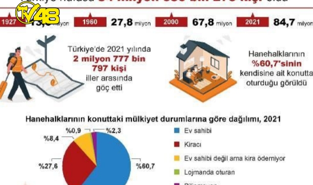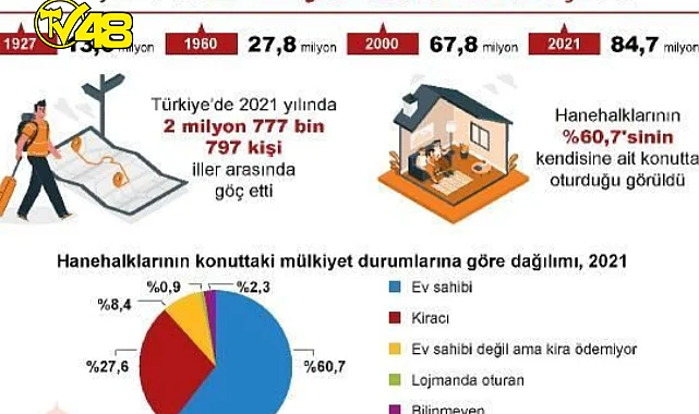 TÜİK, 2021 yılına ilişkin nüfus ve konut sayımı istatistiklerini açıkladı. Buna göre; cumhuriyetin ilk yıllarında yapılan 1927 yılı genel nüfus sayımı sonucuna göre, 13 milyon 648 bin 270 kişi olan Türkiye nüfusu, yıllar içinde sürekli artma eğilimi göstererek 2021 yılında 84 milyon 680 bin 273 kişiye ulaştı. Cumhuriyetin ilk yıllarında, önceki savaş döneminin de etkisiyle kadın nüfus, erkek nüfustan fazla sayılırken, yıllar içinde kadın ve erkek nüfusu hemen hemen eşit büyüklüğe ulaştı. 1927'de 6 milyon 563 bin 879 kişi olan erkek nüfus, 2021 yılında 42 milyon 428 bin 101 kişi oldu. Kadın nüfus ise 1927'de 7 milyon 84 bin 391 kişiyken, 2021 yılında 42 milyon 252 bin 172 kişi oldu. Nüfus artış hızı yıllara göre incelendiğinde, 1935 yılında binde 21,1 olan yıllık nüfus artış hızı 2021 yılında binde 12,7 oldu.