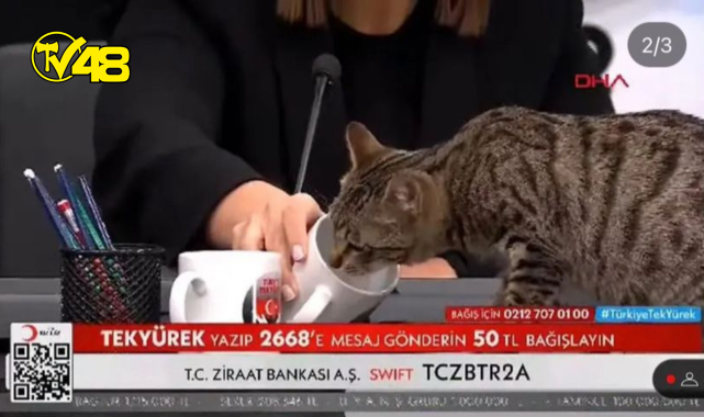 Depremzedeler için tüm kanalların yapmış olduğu ortak yayın; Türkiye Tek Yürek programında Canlı yayında masada bardaktan su içen kedi kalpleri ısıttı...