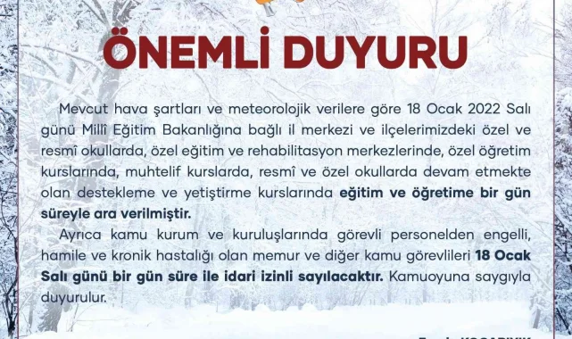 Uşak'ta gece geç saatlerde başlayan kar yağışı, sabaha karşı etkisini arttırdı. Yaklaşık 5 santimetreyi bulan kar yüksekliği nedeniyle Uşak Valiliği açıklamada bulundu. Yapılan resmi açıklamada, 18 Ocak 2022 günü mevcut hava şartları nedeniyle eğitim ve öğretime bir gün ara verdiği belirtildi. Ayrıca yapılan açıklamada kamu kurum ve kuruluşlarında görevli engelli, hamile ve kronik rahatsızlığı bulunan personelin de izinli olduğu belirtildi.