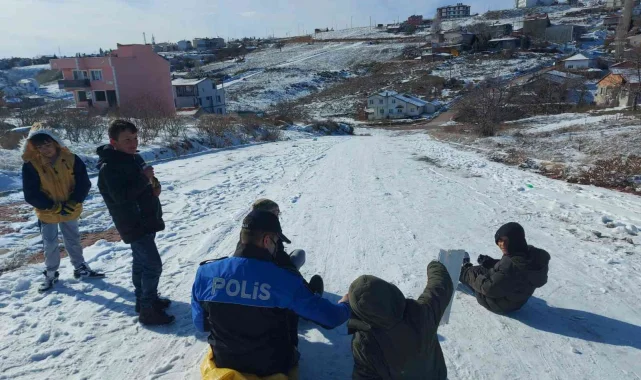 Karlı havada kontrol amaçlı Elmalıdere Mahallesi'ne giden Uşak polisi, poşet yardımıyla kayan çocuklara arkadaş olarak beraber kaydılar. Oynanılan oyunun ardından ekipler çocuklara kek ve meyve suyu dağıttı. Yürekleri ısıtan bu davranış Emniyet Genel Müdürlüğü sosyal medya hesabından paylaşıldı.