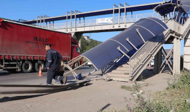 KOCAELİ (İHA) – Kocaeli'de hafriyat kamyonunun çarptığı yaya üst geçidinin bir kısmı çöktü. Faciaya ramak kalırken, kimsenin yaralanmaması sevindirdi.