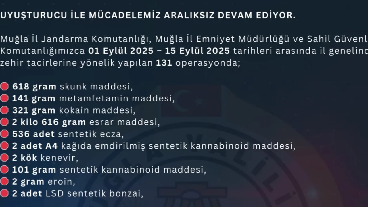 Muğla İl Emniyet Müdürlüğü ve Sahil Güvenlik Komutanlığımızca 01 Eylül 2025 – 15 Eylül 2025 tarihleri arasında il genelinde zehir tacirlerine yönelik yapılan 131 operasyonda; 618 gram skunk maddesi,