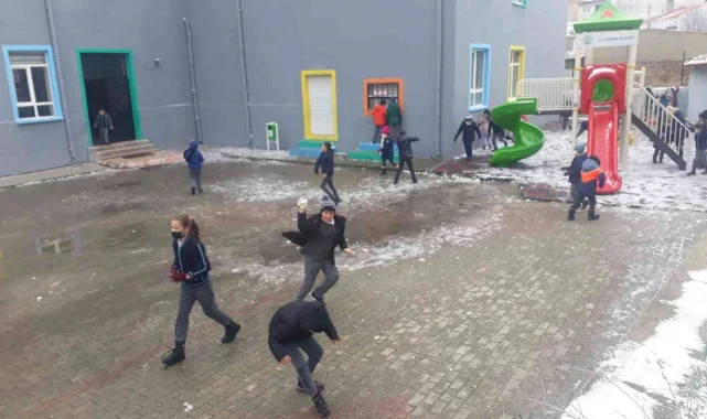 Edirne'nin Uzunköprü ilçesinde etkili olan kar yağışı kenti beyaza bürüdü. Öğrenciler, teneffüste kartopu oynamanın sevincini yaşadı.