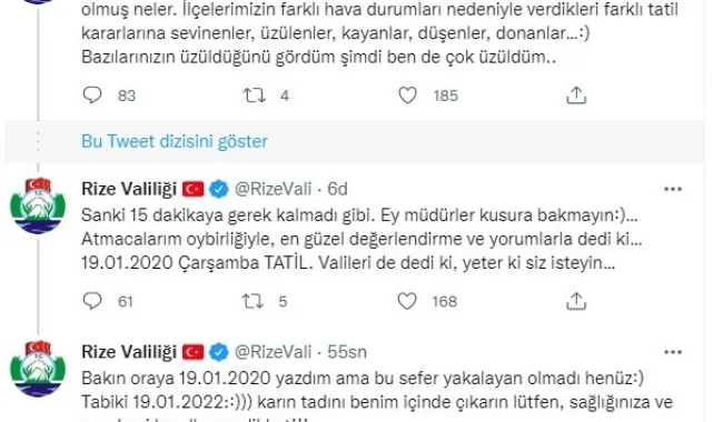 "Sevgili atmacalarım, yoğunluktan dolayı 2 gündür mesajlara bakamıyorum. Neler olmuş neler. İlçelerimizin farklı hava durumları nedeniyle verdikleri farklı tatil kararlarına sevinenler, üzülenler, kayanlar, düşenler, donanlar... Bazılarınızın üzüldüğünü gördüm şimdi ben de çok üzüldüm. Bu müdürler hepsi sizi çok sever buraları emanet ediyorum, üzmeyin atmacalarımı diyorum. İşlerini o kadar iyi yapıyorlar ki, biz ne yapar ne eder öğrencileri okulsuz bırakmayız diyorlar. Ben de 'atmacalarım şartlar elverse siz gitmeyin deseniz bile okullarını ihmal etmez' diyorum. Ey müdürler kusura bakmayın. Atmacalarımın oy birliğiyle, en güzel değerlendirme ve yorumlarla dedi ki; 19 Ocak 2022 Çarşamba tatil. Valileri dedi ki, yeter ki siz isteyin. Karın tadını benim için çıkarın lütfen, sağlığınıza ve pandemi kurallarına dikkat! Ve sizden son ricam; bu karda, buzda sizler için 24 saat köy yollarında fedakarca çalışan özel idare ekiplerimize ve kış koşullarıyla mücadele eden tüm görevlilerimize dua edin, özellikle gıda bulamayan hayvan dostlarımızı unutmayın."