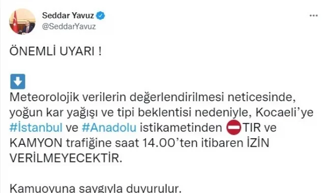 Kocaeli Valisi Seddar Yavuz, sosyal medya hesabından yaptığı açıklamada, "Meteorolojik verilerin değerlendirilmesi neticesinde, yoğun kar yağışı ve tipi beklentisi nedeniyle, Kocaeli'ye İstanbul ve Anadolu istikametinden tır ve kamyon trafiğine saat 14.00'ten itibaren izin verilmeyecektir. Kamuoyuna saygıyla duyurulur" ifadelerini kullandı.