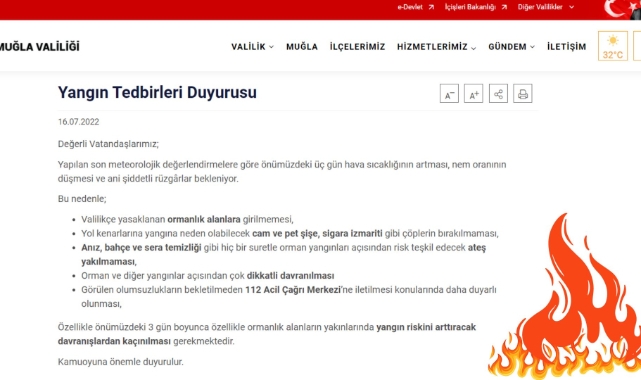 Muğla Valiliği, önümüzdeki üç gün hava sıcaklıklarının artacağına dikkat çekerek, olası yangın riskine karşı vatandaşları bir duyuru yaparak uyardı.