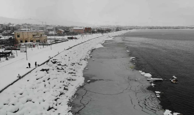 Bitlis'te kar yağışının durmasının ardından başlayan şiddetli soğuklar, Türkiye'nin en büyük sodalı gölü olan Van Gölü kıyılarının buz tutmasına yol açtı. Van-Tatvan arasında 3 bin 755 kilometrekare alana sahip gölün kıyıları, hava sıcaklığının gece sıfırın altında 15 dereceye kadar düşmesiyle buzla kaplandı. Göl kıyısındaki buz tabakasının üzerine yağan ince kar da bembeyaz görüntüsüyle seyrine doyumsuz görüntüler oluşturdu. Göl kıyılarında görenleri hayran bırakan manzara, havadan drone ile görüntülendi.