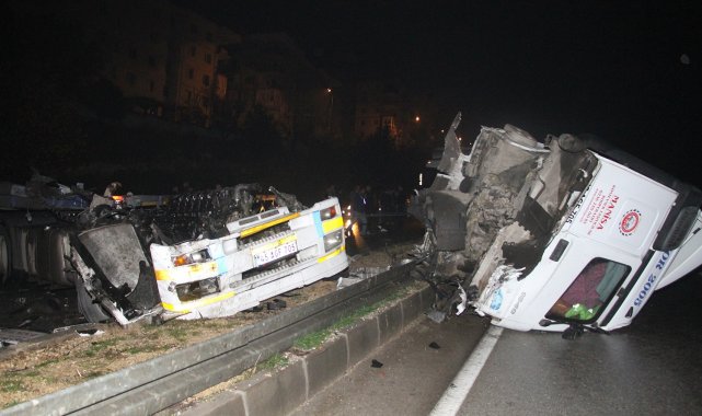 Manisa'nın Kula ilçesinde yağışlı havanın da etkisiyle kayganlaşan yolda kontrolden çıkan tır, aynı yönde seyreden başka bir tıra arkadan çarpıp orta refüje çıktı. Tırın kupa bölümü orta refüjü aşarak karşı şeride geçerken, ikiye bölünen tırın kupası kazanın şiddetini gözler önüne serdi.