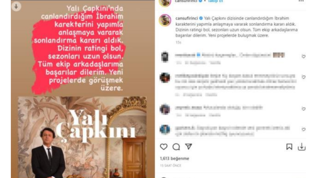 Yalı Çapkını'nda İbrahim karakterini canlandıran Cansu Fırıncı, kadrodan ayrılma kararı aldı. Instagram hesabından bir paylaşım yaparak yapım şirketiyle anlaşmaya vardıklarını söyleyen oyuncu, "Yalı Çapkını'nda canlandırdığım İbrahim karakterini yapımla anlaşmaya vararak sonlandırma kararı aldık. Dizinin reytingi bol, sezonları uzun olsun. Tüm ekip arkadaşlarıma başarılar dilerim. Yeni projelerde görüşmek üzere" dedi.