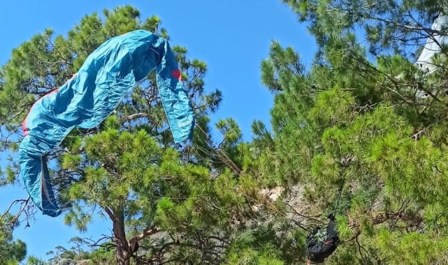 Muğla'nın Fethiye ilçesinde yamaç paraşütü pilotu inişe geçtiği sırada bölgede bulunan ağacın dallarına takılarak ağaçta asılı kaldı. Olay, Ölüdeniz Mahallesi'nde meydana geldi.