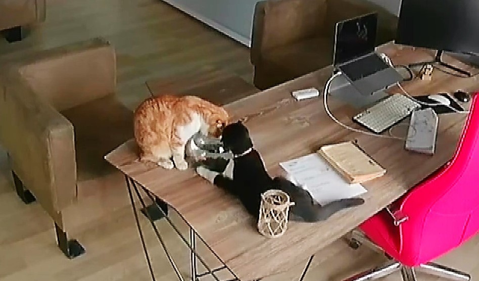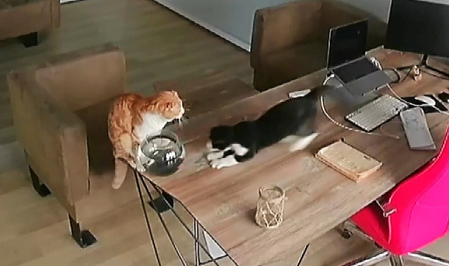 Denizli'de bir ofiste barındırılan 2 yaramaz kedi, akvaryumdaki balıkların suyundan içerken bir yandan da oynamaya çalışınca olanlar oldu. İçi su dolu balık akvaryumunu düşüren kedilerin, güvenlik kameralarına yansıyan şaşkınlığı güldürdü.