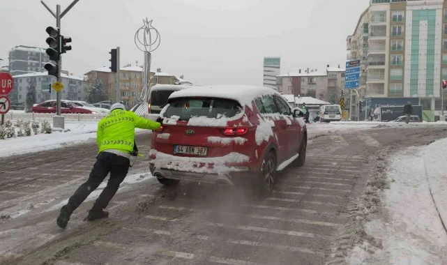 Uşak'ta etkili olan kar yağışının ardından trafikte zor anlar yaşayan sürücülerin imdadına trafik polisleri yetişti.