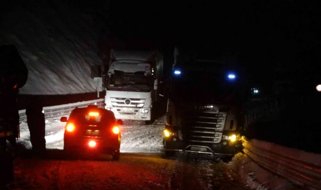 Kar yağışı ve tipi nedeniyle onlarca araç yolda mahsur kalırken, bazı tırlar ise yoldan çıkarak kara saplandı.