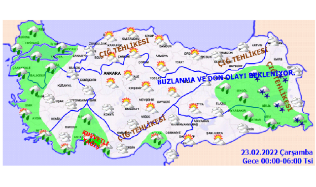 Yağışların Trakya ile Aydın, İzmir'in güney ve doğusu, Muğla, Adana'nın güneyi, Osmaniye, Hatay, Burdur'un doğusu, Isparta'nın güneyi, Adıyaman, Ş. Urfa'nın kuzey ve batısı, Diyarbakır, Batman ile G. Antep çevrelerinde kuvvetli, Antalya'nın doğusu (İbradı, Akseki, Gündoğmuş ve Alanya ilçelerinde yerel olarak kuvvetli; Aksu, Serik ve Manavgat ilçelerinde yerel olarak çok kuvvetli olması bekleniyor. Bu sabah ve gece saatlerinde iç ve doğu kesimlerde buzlanma ve don ile birlikte yer yer sis ve pus olayı bekleniyor. Akdeniz Bölgesi'nin yüksek kesimlerinde (Toros Dağları), İç Anadolu'nun güneyinde ve doğusunda, Karadeniz Bölgesi'nin iç ve yüksek kesimleri ile Doğu Anadolu Bölgesi'nde yüksek kar örtüsü bulunan eğimli yerlerde çığ tehlikesi bulunmaktadır.